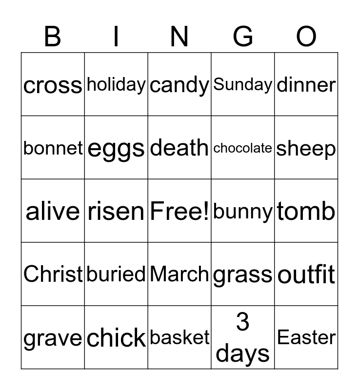 This bingo card has a free space and 24 words: buried, chick, death, grave, dinner, cross, bonnet, holiday, bunny, March, chocolate, alive, grass, outfit, eggs, 3 days, tomb, candy, sheep, risen, Easter, Christ, Sunday and basket.