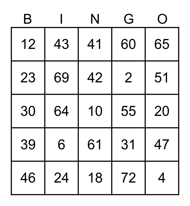 This bingo card has 25 words: 6, 18, 42, 46, 65, 12, 23, 43, 55, 61, 2, 30, 31, 47, 69, 4, 20, 41, 51, 64, 10, 24, 39, 60 and 72.
