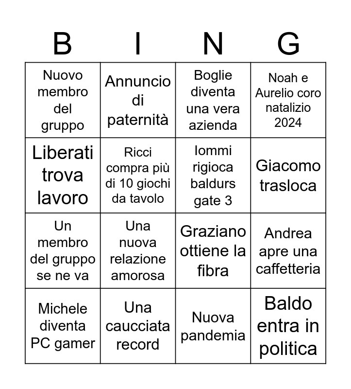 This bingo card has 16 words: Una caucciata record, Andrea apre una caffetteria, Boglie diventa una vera azienda, Nuovo membro del gruppo, Un membro del gruppo se ne va, Annuncio di paternità, Graziano ottiene la fibra, Nuova pandemia, Liberati trova lavoro, Ricci compra più di 10 giochi da tavolo, Michele diventa PC gamer, Noah e Aurelio coro natalizio 2024, Una nuova relazione amorosa, Giacomo trasloca, Iommi rigioca baldurs gate 3 and Baldo entra in politica.