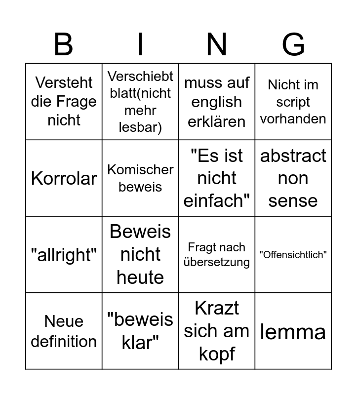 This bingo card has 16 words: "beweis klar", "Offensichtlich", muss auf english erklären, Versteht die Frage nicht, "allright", Verschiebt blatt(nicht mehr lesbar), Fragt nach übersetzung, Krazt sich am kopf, Korrolar, Komischer beweis, Neue definition, Nicht im script vorhanden, Beweis nicht heute, abstract non sense, "Es ist nicht einfach" and lemma.