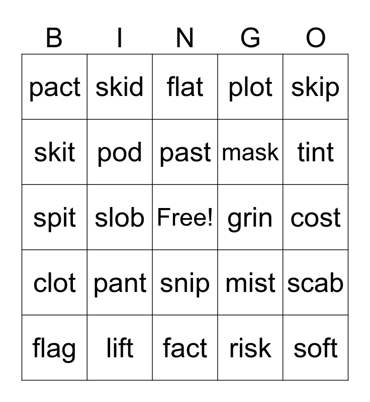 This bingo card has a free space and 29 words: flag, bond, slob, blob, pact, flat, pod, pant, grin, lift, cost, soft, fact, risk, tint, snap, snip, clot, skip, spit, mist, gram, mask, skit, plot, skid, scab, past and raft.