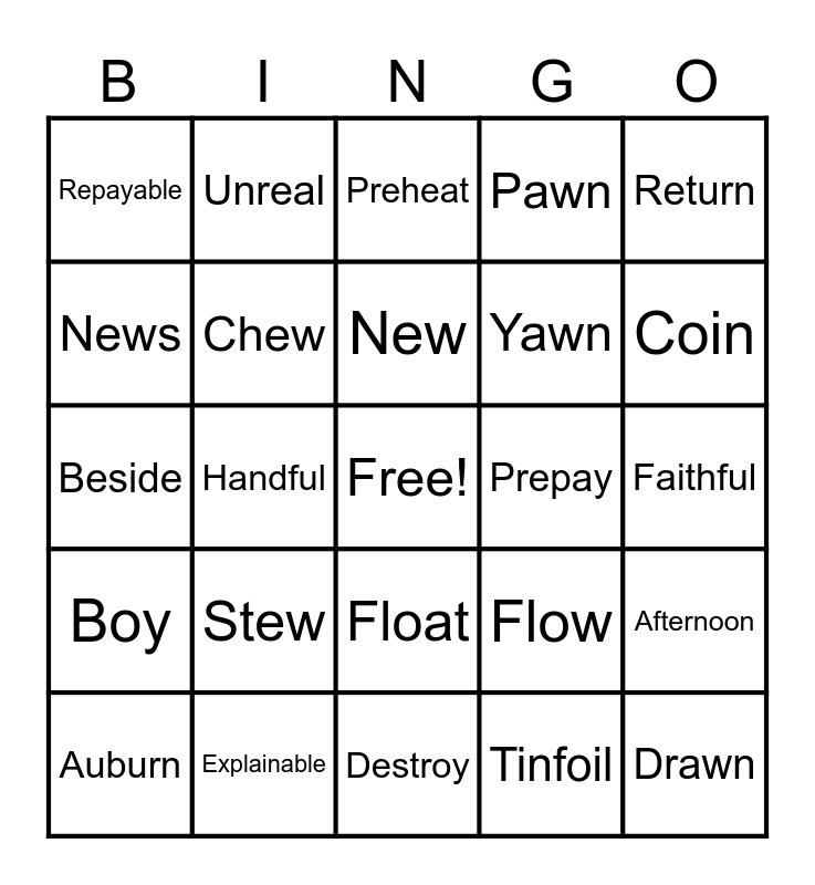 This bingo card has a free space and 149 words: Food, Soon, Feed, Flirt, Broom, Flow, Spoon, Brain, Smooth, Choose, Sport, Tooth, Rooster, Scooter, Moonlight, Cartoon, Toothbrush, Schoolroom, Teaspoon, Shampoo, Raccoon, Afternoon, Unlock, Distrust, Agreeable, Handful, Unreal, Discard, Dismay, Unchain, Helpful, Teachable, Drinkable, Faithful, Unthinkable, Disgusting, Distrustful, Ungrateful, Yawn, Fault, Claw, Haul, Float, Draw, Spool, Crawl, Cool, Lawn, Loan, Cause, Exhaust, Author, Auburn, August, Drawing, Lawnmower, Lawyer, Igloo, Imperfect, Advertise, Return, Preheat, Madness, Helpless, Refill, Unseen, Prepay, Discard, Endless, Freshness, Portable, Grateful, Returnable, Repayable, Boastfulness, Unpreventable, Distrustfulness, Boil, Boy, Point, Paint, Roy, Pawn, Joy, Soil, Goose, Coin, Turmoil, Employ, Enjoy, Destroy, Tinfoil, Boycott, Joyride, Oyster, Appointment, Sharpshooter, Become, Delay, Fraction, Beside, Defrost, Present, Rethink, Action, Mention, Coolness, Toothless, Belonging, Detention, Devotion, Reflection, New, Grew, Grain, Chew, Stew, News, Fee, Drew, Drawn, Drew, Flew, Jewel, Newsstand, Newscast, Chewable, New York, Newspaper, Screwdriver, Newsletter, Subscribe, Storekeeper, Infect, Inflate, Demand, Export, Nightly, Lucky, Likely, Reasonable, Inspection, Exactly, Explainable, Infection, Inspect, Expand, Badly and Windy.