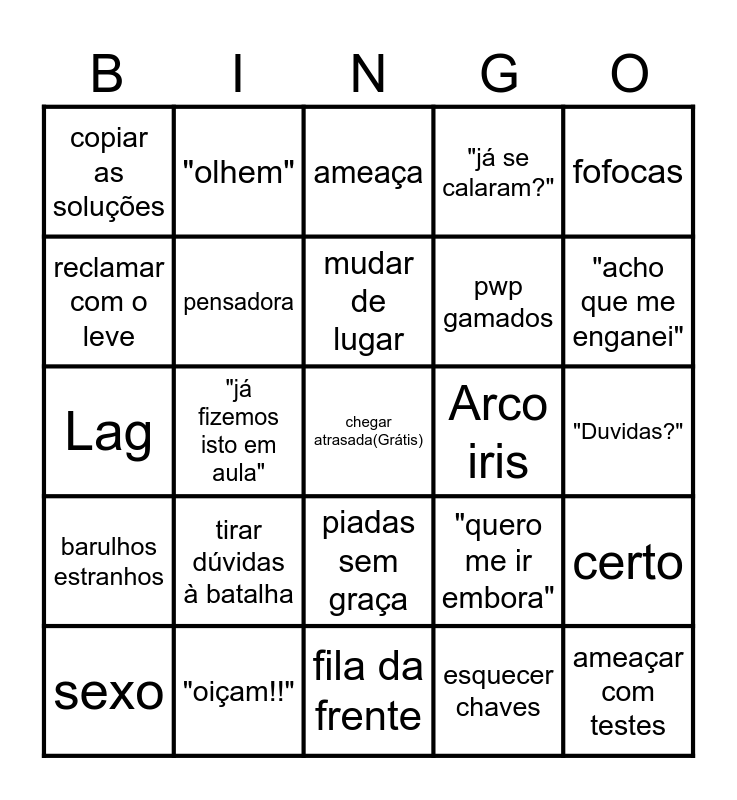 This bingo card has a free space and 28 words: certo, "para relaxar", pwp gamados, esquecer chaves, reclamar com o leve, ameaça, "olhem", barulhos estranhos, Arco iris, sexo, Lag, "já se calaram?", "oiçam!!", fila da frente, "acho que me enganei", bolas, tirar dúvidas à batalha, pensadora, mudar de lugar, piadas sem graça, copiar as soluções, surda, ameaçar com testes, "já fizemos isto em aula", "Duvidas?", "quero me ir embora", fofocas and Servir de poste.