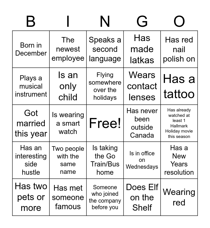 This bingo card has a free space and 25 words: Two people with the same name, Someone who joined the company before you, Flying somewhere over the holidays, Has two pets or more, Has red nail polish on, Born in December, Plays a musical instrument, The newest employee, Has never been outside Canada, Is taking the Go Train/Bus home, Wears contact lenses, Got married this year, Is in office on Wednesdays, Has a New Years resolution, Is an only child, Can't whistle, Has already watched at least 1 Hallmark Holiday movie this season, Speaks a second language, Has a tattoo, Is wearing a smart watch, Wearing red, Has met someone famous, Has an interesting side hustle, Has made latkas and Does Elf on the Shelf.