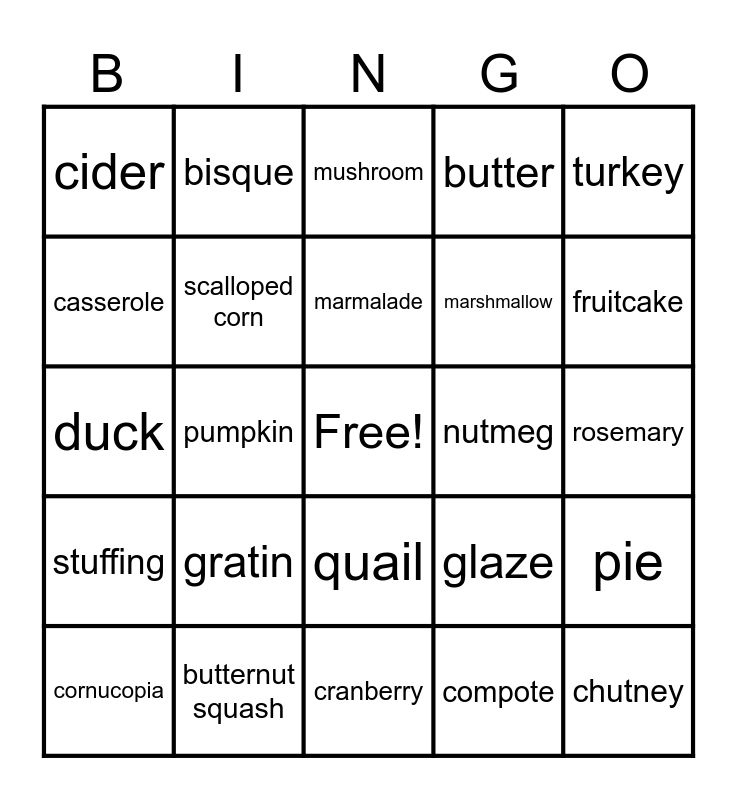 This bingo card has a free space and 29 words: cornucopia, allspice, pumpkin, acorn squash, cider, mushroom, scalloped corn, gratin, nutmeg, butternut squash, rosemary, chutney, cranberry, compote, fruitcake, ginger, quail, stuffing, turkey, duck, glaze, green bean, marshmallow, casserole, butter, bisque, pie, marmalade and zucchini.