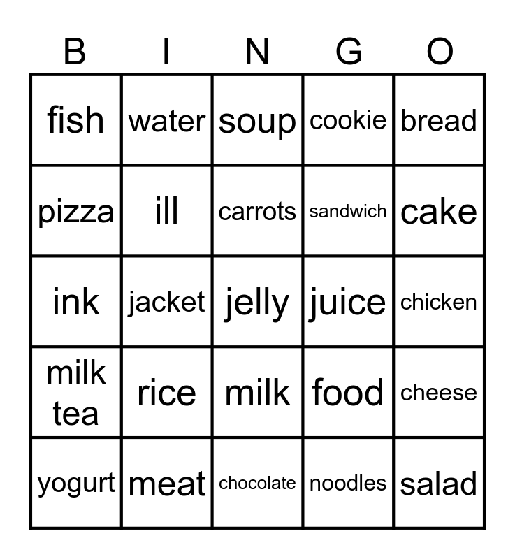 This bingo card has a free space and 24 words: rice, meat, carrots, yogurt, bread, fish, pizza, water, juice, milk, sandwich, ink, food, cheese, ill, noodles, chicken, soup, cake, jacket, salad, milk tea, cookie and chocolate.