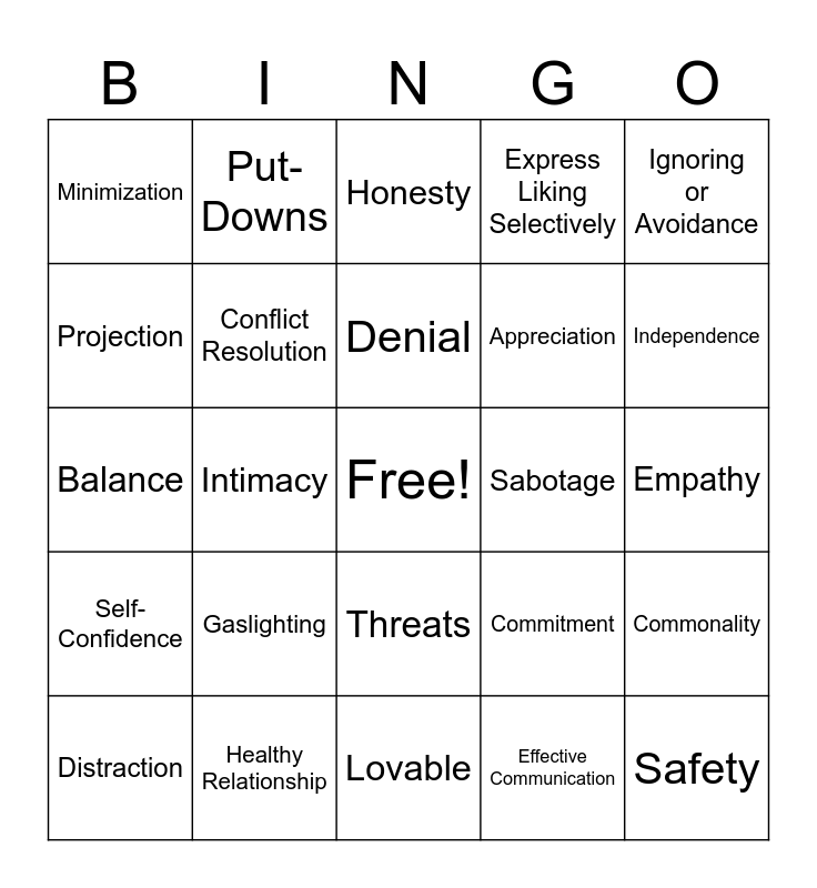 This bingo card has a free space and 24 words: Gaslighting, Healthy Relationship, Denial, Distraction, Ignoring or Avoidance, Minimization, Projection, Put-Downs, Sabotage, Threats, Appreciation, Balance, Commitment, Commonality, Conflict Resolution, Effective Communication, Empathy, Honesty, Independence, Intimacy, Safety, Self-Confidence, Express Liking Selectively and Lovable.