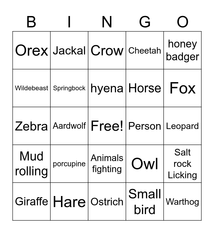 This bingo card has a free space and 24 words: Giraffe, porcupine, hyena, Small bird, honey badger, Orex, Jackal, Crow, Person, Leopard, Zebra, Springbock, Owl, Salt rock Licking, Wildebeast, Hare, Ostrich, Cheetah, Fox, Mud rolling, Aardwolf, Animals fighting, Horse and Warthog.