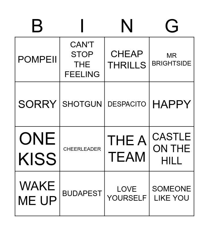 This bingo card has 37 words: SHAPE OF YOU, UPTOWN FUNK, THINKING OUT LOUD, DESPACITO, PERFECT, ONE DANCE, HAPPY, ALL OF ME, SORRY, RATHER BE, CASTLE ON THE HILL, MR BRIGHTSIDE, WAKE ME UP, LOVE YOURSELF, SHOTGUN, SOMEONE LIKE YOU, TAKE ME TO CHURCH, CHEAP THRILLS, LET HER GO, BUDAPEST, POMPEII, CHEERLEADER, SAY YOU WON'T LET GO, SOMEONE YOU LOVED, HELLO, NEW RULES, CAN'T STOP THE FEELING, WHAT DO YOU MEAN, 7 YEARS, TITANIUM, BLURRED LINES, STAY WITH ME, THE A TEAM, GET LUCKY, HAVANA, ONE KISS and COUNTING STARS.