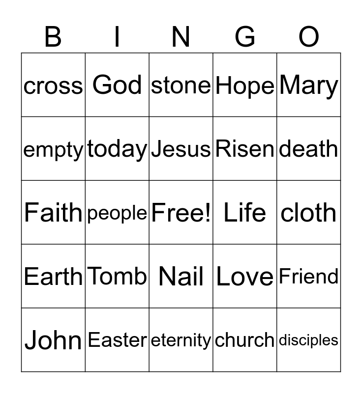 This bingo card has a free space and 24 words: Tomb, Easter, Jesus, John, Mary, cross, empty, God, Life, Nail, Risen, Faith, Love, Friend, today, church, cloth, stone, death, people, disciples, Earth, Hope and eternity.