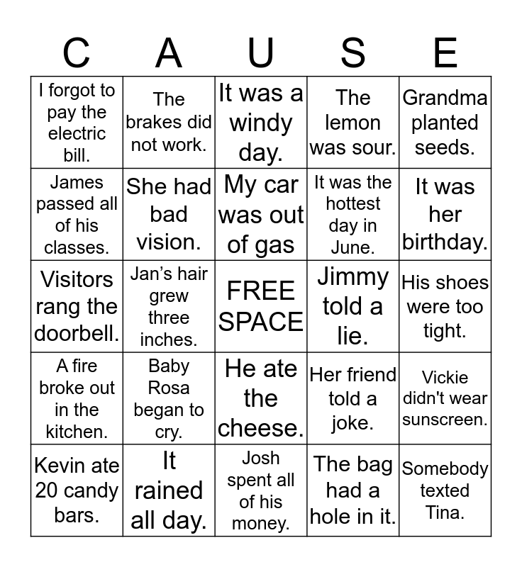 This bingo card has a free space and 24 words: Baby Rosa began to cry., It rained all day., My car was out of gas, Kevin ate 20 candy bars., Grandma planted seeds., I forgot to pay the electric bill., James passed all of his classes., The brakes did not work., Jimmy told a lie., He ate the cheese., It was the hottest day in June., Visitors rang the doorbell., Her friend told a joke., Vickie didn't wear sunscreen., She had bad vision., The bag had a hole in it., His shoes were too tight., It was a windy day., It was her birthday., Jan’s hair grew three inches., Somebody texted Tina., A fire broke out in the kitchen., The lemon was sour. and Josh spent all of his money..