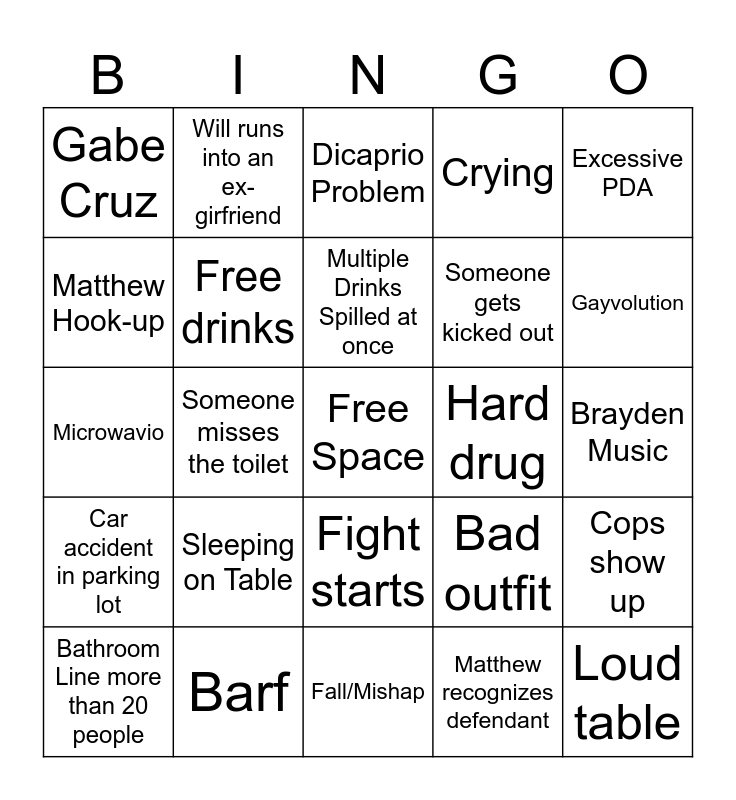 This bingo card has a free space and 24 words: Sleeping on Table, Barf, Multiple Drinks Spilled at once, Bathroom Line more than 20 people, Excessive PDA, Gabe Cruz, Matthew Hook-up, Will runs into an ex-girfriend, Hard drug, Fight starts, Someone gets kicked out, Microwavio, Bad outfit, Cops show up, Free drinks, Matthew recognizes defendant, Brayden Music, Dicaprio Problem, Gayvolution, Someone misses the toilet, Loud table, Car accident in parking lot, Crying and Fall/Mishap.