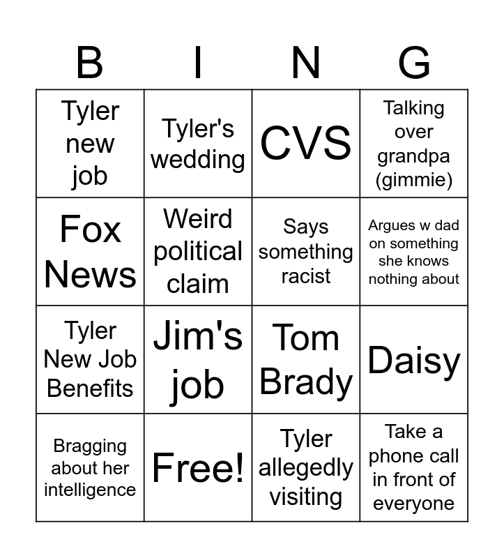 This bingo card has 16 words: Free!, Daisy, CVS, Tyler new job, Tyler New Job Benefits, Tyler's wedding, Tom Brady, Tyler allegedly visiting, Fox News, Weird political claim, Bragging about her intelligence, Talking over grandpa (gimmie), Jim's job, Argues w dad on something she knows nothing about, Says something racist and Take a phone call in front of everyone.