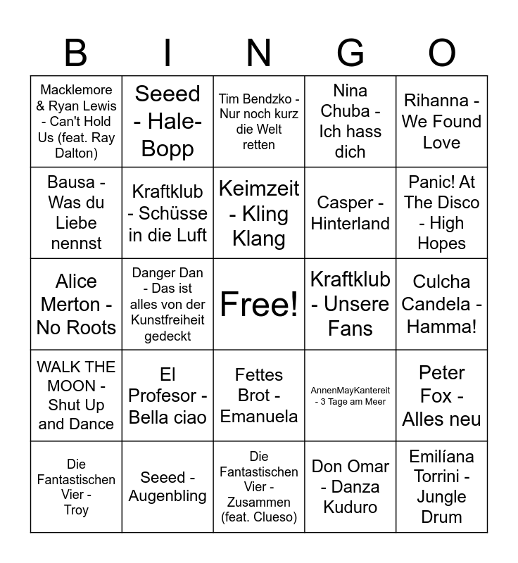 This bingo card has a free space and 60 words: Kraftklub - Schüsse in die Luft, Seeed - Augenbling, Mark Forster - Au Revoir (feat. Sido), WALK THE MOON - Shut Up and Dance, Don Omar - Danza Kuduro, Imagine Dragons - Radioactive, Kraftklub - Schüsse in die Luft, The Weeknd - Blinding Lights, Casper - Hinterland, Kraftklub - Zu jung, Nina Chuba - Ich hass dich, Fettes Brot - Jein, Bausa - Was du Liebe nennst, Kraftklub - Chemie Chemie Ya, Pitbull - Give Me Everything (feat. Ne-Yo, Afrojack & Nayer), Macklemore & Ryan Lewis - Can't Hold Us (feat. Ray Dalton), Emilíana Torrini - Jungle Drum, Rihanna - We Found Love, Marteria - Lila Wolken, Keimzeit - Kling Klang, Kraftklub - Unsere Fans, Tim Bendzko - Nur noch kurz die Welt retten, Die Fantastischen Vier - Troy, Peter Fox - Alles neu, Kraftklub - Songs für Liam, Nina Chuba - Wildberry Lillet, Jennifer Lopez - On The Floor, Nathan Evans - Wellerman (Sea Shanty), Panic! At The Disco - High Hopes, Kraftklub - Eure Mädchen, Kraftklub - Scheissindiedisko, Nina Chuba - Mangos mit Chili, Peter Fox - Schüttel deinen Speck, Seeed - Ding, Seeed - Hale-Bopp, Mark Forster - Übermorgen, Reel 2 Real - I Like To Move It, Danger Dan - Das ist alles von der Kunstfreiheit gedeckt, Shakira - Waka Waka, Alice Merton - No Roots, AnnenMayKantereit - Pocahontas, El Profesor - Bella ciao, Culcha Candela - Hamma!, Die Prinzen - Alles nur geklaut, AnnenMayKantereit - 3 Tage am Meer, Casper - Im Ascheregen, Pitbull - Timber (feat. Ke$ha), Kraftklub - Fahr mit mir (feat. Tokio Hotel), Das Bo - Türlich, Türlich (Sicher, Dicker), Fettes Brot - Emanuela, Die Fantastischen Vier - Zusammen (feat. Clueso), Die Fantastischen Vier - Die Da!?!, Andreas Bourani - Nur in meinem Kopf, CRO - Einmal um die Welt, Billie Eilish - bad guy, Camila Cabello - Havana, Mark Forster - Drei Uhr Nachts, Dilla - photosynthese, Domiziana - Ohne Benzin and Culcha Candela - Monsta.