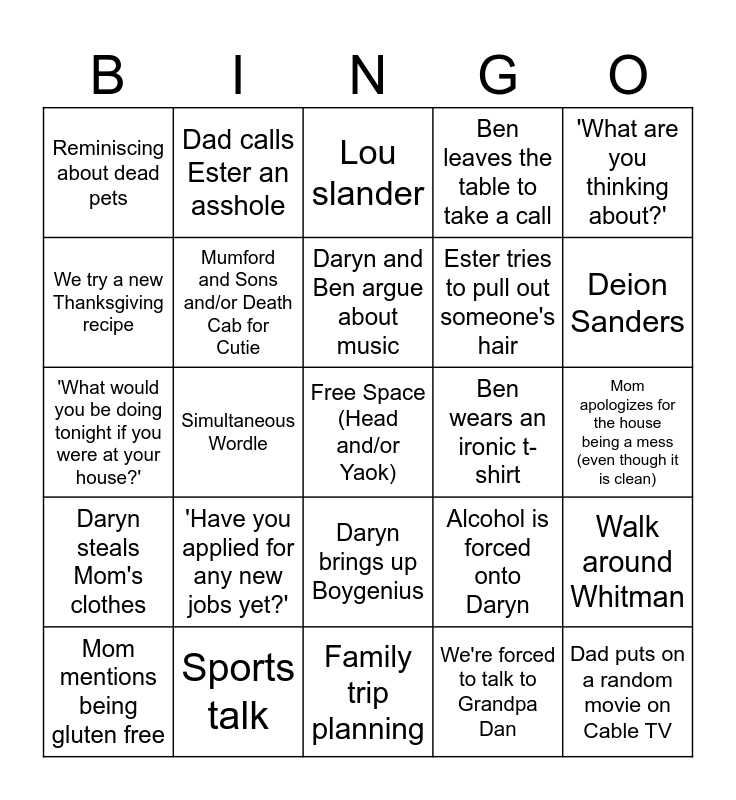 This bingo card has a free space and 24 words: 'Have you applied for any new jobs yet?', Sports talk, Daryn and Ben argue about music, Mom mentions being gluten free, 'What are you thinking about?', Reminiscing about dead pets, We try a new Thanksgiving recipe, Dad calls Ester an asshole, Ben wears an ironic t-shirt, Daryn brings up Boygenius, Ester tries to pull out someone's hair, 'What would you be doing tonight if you were at your house?', Alcohol is forced onto Daryn, Walk around Whitman, Mumford and Sons and/or Death Cab for Cutie, We're forced to talk to Grandpa Dan, Mom apologizes for the house being a mess (even though it is clean), Lou slander, Deion Sanders, Simultaneous Wordle, Dad puts on a random movie on Cable TV, Daryn steals Mom's clothes, Ben leaves the table to take a call and Family trip planning.