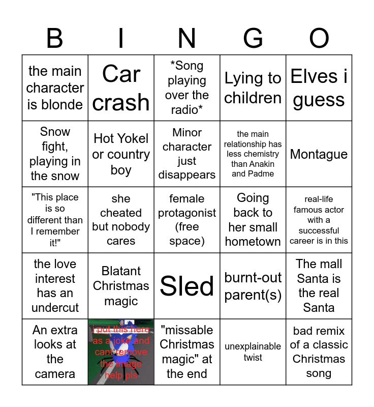 This bingo card has 1 images, a free space and 50 words: Random burst of Christmas music, bad remix of a classic Christmas song, "Oh!", "missable Christmas magic" at the end, Blatant Christmas magic, Dead family member(s), Car crash, Memory loss, Snow fight, playing in the snow, spoiled girl, Hot Yokel or country boy, Lying to children, The mall Santa is the real Santa, burnt-out parent(s), City boyfriend (bad), multiple plotlines, Minor character just disappears, Going back to her small hometown, protagonist has some aversion to Christmas, Elves i guess, she cheated but nobody cares, unexplainable twist, the main character is blonde, the main relationship has less chemistry than Anakin and Padme, Christmas tree, she's not like other girls, Montague, Baking, *Song playing over the radio*, Sled, The love interest is *not* hot (opinion), Two men having a *bro* moment, Side characters are more interesting, learning a lesson about something, i put this here as a joke and cant remove the image help pls, angry driving, weird innuendo(s), iTs a cHRisTmAs miRaCLe, Dubius morals, real-life famous actor with a successful career is in this, Pop culture references! This movie is hip with the kids yo, PRODUCT PLACEMENT, fainting, fussing with the Christmas decorations, An extra looks at the camera, "This place is so different than I remember it!", Crying, Mistletoe, the love interest has an undercut and Puppies.
