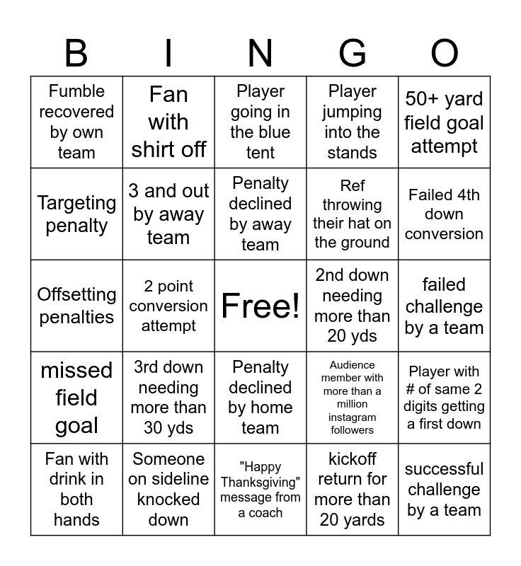 This bingo card has a free space and 41 words: 3 and out by home team, Offsetting penalties, 2 penalties by same team on same play, 3 and out by away team, Someone on sideline knocked down, Penalty declined by home team, Penalty declined by away team, 40 or more yard gain, 50+ yard field goal attempt, missed field goal, 2 point conversion attempt, Player jumping into the stands, successful challenge by a team, failed challenge by a team, 2nd down needing more than 20 yds, 3rd down needing more than 30 yds, Fumble lost to other team, Fumble recovered by own team, 2 fans that have painted faces in one shot, Player going in the blue tent, Player with # of same 2 digits getting a first down, "Happy Thanksgiving" message from a QB, "Happy Thanksgiving" message from a coach, Ref throwing their hat on the ground, Punt Return for more than 25 yards, Offensive scoring drive that takes 4 plays or fewer, kickoff return for more than 20 yards, A caught fair catch, Failed 4th down conversion, Offensive snap not to QB, Successful 4th down conversion, Fan with shirt off, Fan with drink in both hands, One handed catch, Audience member with more than a million instagram followers, Targeting penalty, Roughing the passer penalty, Gain = 13 yrds, Penalty on a player with number divisible by 9, Helmet coming off on the field and Punt that lands out of bounds.