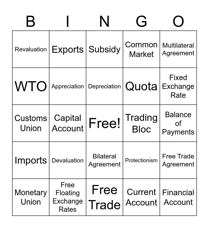 This bingo card has a free space and 27 words: Protectionism, Tariffs, Quota, Free Trade, WTO, Subsidy, Exports, Imports, Trading Bloc, Free Trade Agreement, Customs Union, Common Market, Monetary Union, Free Floating Exchange Rates, Fixed Exchange Rate, Managed Exchange Rate, Appreciation, Depreciation, Devaluation, Revaluation, Balance of Payments, Current Account, Capital Account, Financial Account, Bilateral Agreement, Multilateral Agreement and Administrative Barriers.