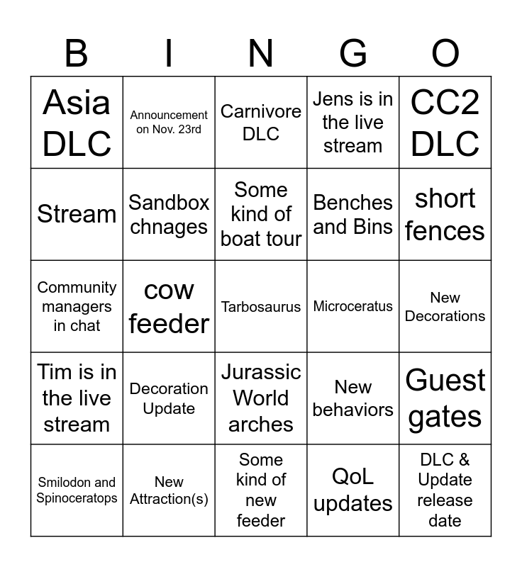 This bingo card has a free space and 24 words: Decoration Update, New Attraction(s), Some kind of boat tour, Smilodon and Spinoceratops, CC2 DLC, Asia DLC, Stream, Announcement on Nov. 23rd, Microceratus, Jurassic World arches, Benches and Bins, Community managers in chat, New behaviors, Guest gates, Sandbox chnages, QoL updates, New Decorations, Carnivore DLC, short fences, cow feeder, DLC & Update release date, Tim is in the live stream, Jens is in the live stream and Some kind of new feeder.