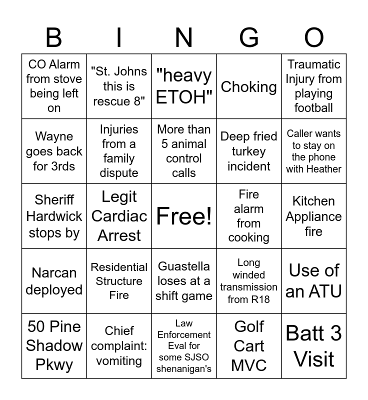 This bingo card has a free space and 24 words: Residential Structure Fire, Chief complaint: vomiting, More than 5 animal control calls, 50 Pine Shadow Pkwy, Traumatic Injury from playing football, CO Alarm from stove being left on, Wayne goes back for 3rds, "St. Johns this is rescue 8", Fire alarm from cooking, Guastella loses at a shift game, Deep fried turkey incident, Sheriff Hardwick stops by, Long winded transmission from R18, Use of an ATU, Injuries from a family dispute, Golf Cart MVC, Kitchen Appliance fire, "heavy ETOH", Caller wants to stay on the phone with Heather, Legit Cardiac Arrest, Batt 3 Visit, Narcan deployed, Choking and Law Enforcement Eval for some SJSO shenanigan's.