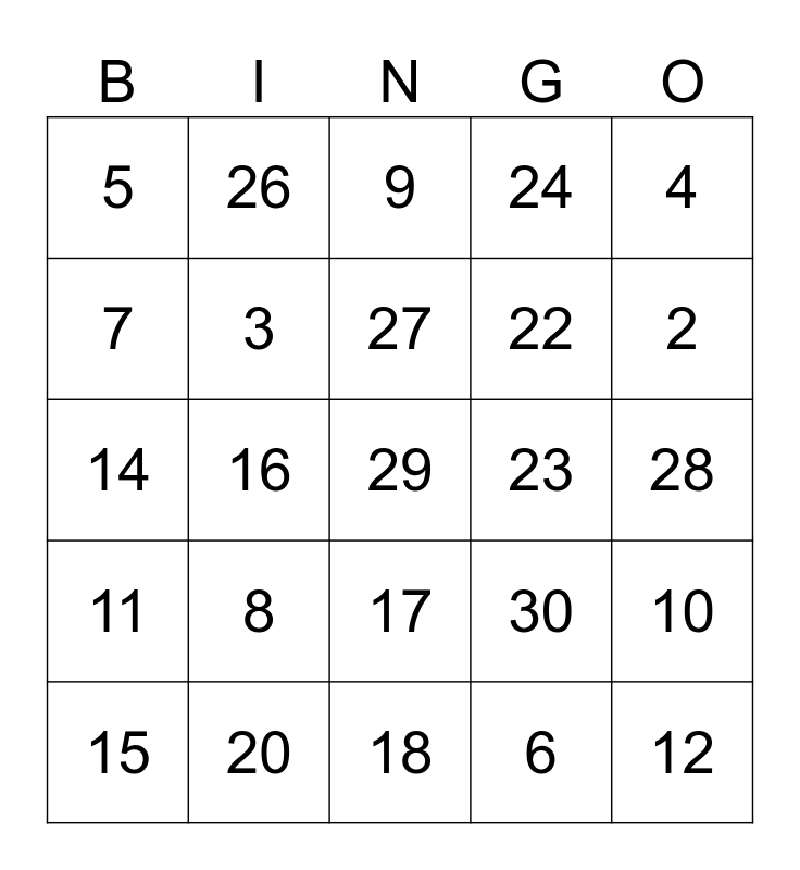 This bingo card has 30 words: 15, 21, 27, 19, 4, 5, 26, 17, 23, 12, 11, 3, 1, 6, 10, 25, 16, 29, 30, 2, 14, 20, 9, 22, 28, 7, 8, 18, 24 and 13.