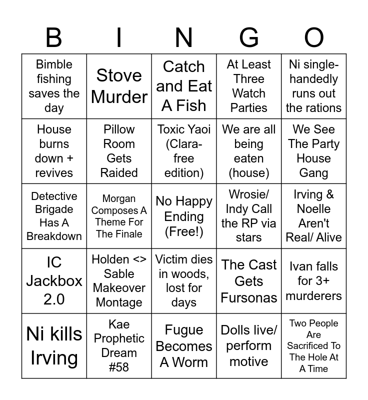This bingo card has a free space and 24 words: Holden <> Sable Makeover Montage, Kae Prophetic Dream #58, Toxic Yaoi (Clara-free edition), Ni kills Irving, Ni single-handedly runs out the rations, Bimble fishing saves the day, House burns down + revives, Stove Murder, Wrosie/ Indy Call the RP via stars, Victim dies in woods, lost for days, We are all being eaten (house), Detective Brigade Has A Breakdown, The Cast Gets Fursonas, Ivan falls for 3+ murderers, Pillow Room Gets Raided, Dolls live/ perform motive, Irving & Noelle Aren't Real/ Alive, Catch and Eat A Fish, We See The Party House Gang, Morgan Composes A Theme For The Finale, Two People Are Sacrificed To The Hole At A Time, IC Jackbox 2.0, At Least Three Watch Parties and Fugue Becomes A Worm.