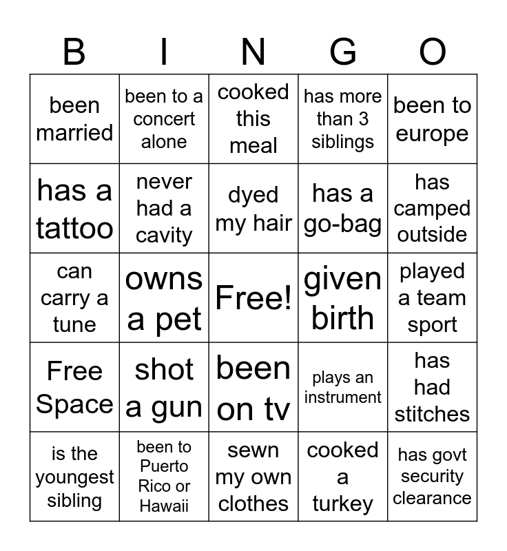 This bingo card has a free space and 25 words: shot a gun, sewn my own clothes, dyed my hair, is the youngest sibling, been to europe, been married, has a tattoo, been to a concert alone, given birth, been on tv, has a go-bag, can carry a tune, plays an instrument, has had stitches, never had a cavity, has run a marathon, played a team sport, cooked this meal, has camped outside, owns a pet, has govt security clearance, been to Puerto Rico or Hawaii, Free Space, has more than 3 siblings and cooked a turkey.