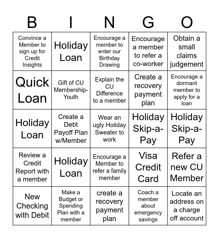This bingo card has a free space and 24 words: Holiday Loan, Make a Budget or Spending Plan with a member, Explain the CU Difference to a member, New Checking with Debit, Obtain a small claims judgement, Convince a Member to sign up for Credit Insights, Quick Loan, Holiday Loan, Holiday Skip-a-Pay, Encourage a Member to refer a family member, Create a recovery payment plan, Holiday Loan, Visa Credit Card, Refer a new CU Member, Gift of CU Membership-Youth, Coach a member about emergency savings, Holiday Skip-a-Pay, Encourage a member to enter our Birthday Drawing, Encourage a dormant member to apply for a loan, Create a Debt Payoff Plan w/Member, Locate an address on a charge off account, Review a Credit Report with a member, Encourage a member to refer a co-worker and create a recovery payment plan.