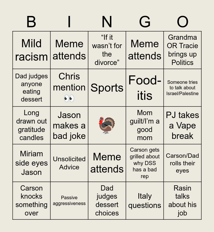This bingo card has a free space and 29 words: Meme attends, Passive aggressiveness, “If it wasn’t for the divorce”, Aunt Fight, Grandma OR Tracie brings up Politics, Mild racism, Chris mention 👀, Sports, Mom guilt/I’m a good mom, Carson/Dad rolls their eyes, Carson knocks something over, Jason makes a bad joke, Italy questions, Rasin talks about his job, Long drawn out gratitude candles, Questions about babies/marriage, Dad judges dessert choices, Carson gets grilled about why DSS has a bad rep, Someone tries to talk about Israel/Palestine, Miriam side eyes Jason, Unsolicited Advice, “The phone works both ways”, Food-itis, PJ takes a Vape break, Dad judges anyone eating dessert, Meme attends, Meme attends, Meme attends and Meme attends.