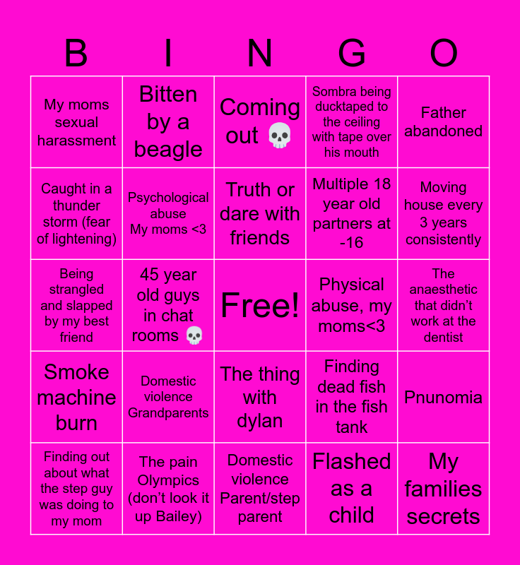 This bingo card has a free space and 24 words: Domestic violence Grandparents, The pain Olympics (don’t look it up Bailey), Truth or dare with friends, Finding out about what the step guy was doing to my mom, Father abandoned, My moms sexual harassment, Caught in a thunder storm (fear of lightening), Bitten by a beagle, Physical abuse, my moms<3, The thing with dylan, Multiple 18 year old partners at -16, Being strangled and slapped by my best friend, Finding dead fish in the fish tank, Pnunomia, Psychological abuse My moms <3, Flashed as a child, The anaesthetic that didn’t work at the dentist, Coming out 💀, Moving house every 3 years consistently, 45 year old guys in chat rooms 💀, My families secrets, Smoke machine burn, Sombra being ducktaped to the ceiling with tape over his mouth and Domestic violence Parent/step parent.