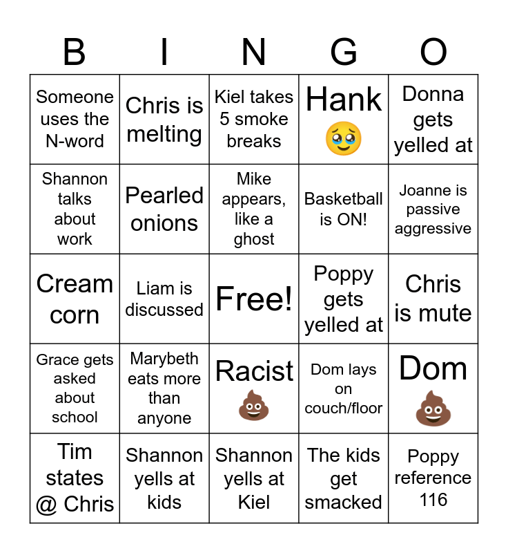 This bingo card has a free space and 24 words: Tim states @ Chris, Marybeth eats more than anyone, Mike appears, like a ghost, The kids get smacked, Donna gets yelled at, Someone uses the N-word, Chris is melting, Kiel takes 5 smoke breaks, Poppy gets yelled at, Chris is mute, Cream corn, Pearled onions, Dom lays on couch/floor, Dom 💩, Shannon talks about work, Shannon yells at kids, Shannon yells at Kiel, Hank 🥹, Joanne is passive aggressive, Grace gets asked about school, Liam is discussed, Racist 💩, Basketball is ON! and Poppy reference 116.