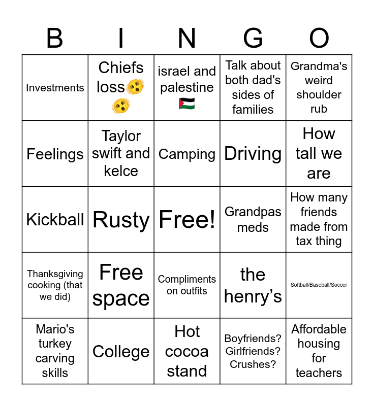 This bingo card has a free space and 25 words: Free space, Hot cocoa stand, Camping, Mario's turkey carving skills, Grandma's weird shoulder rub, Investments, Feelings, Chiefs loss🫨🫨, Grandpas meds, Compliments on outfits, Driving, Kickball, the henry’s, Softball/Baseball/Soccer, Taylor swift and kelce, Tax thing, How many friends made from tax thing, israel and palestine 🇵🇸, How tall we are, Rusty, Affordable housing for teachers, College, Thanksgiving cooking (that we did), Talk about both dad's sides of families and Boyfriends? Girlfriends? Crushes?.