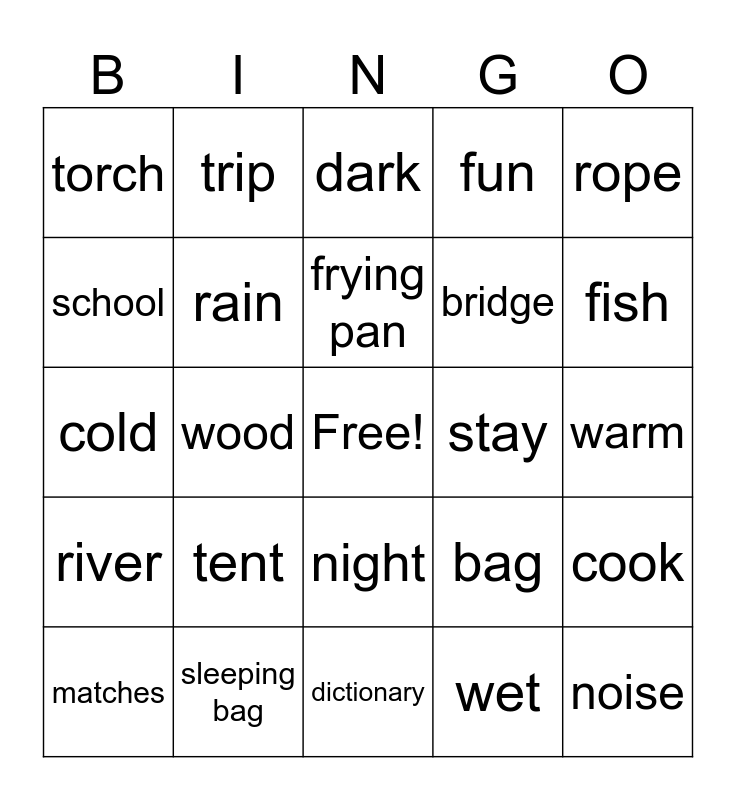 This bingo card has a free space and 24 words: tent, sleeping bag, frying pan, matches, rope, torch, school, trip, stay, night, bridge, cold, bag, cook, rain, wet, warm, dark, fish, wood, noise, river, fun and dictionary.