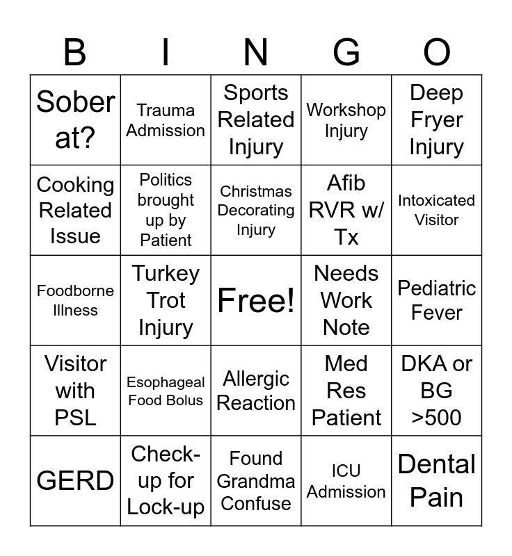 This bingo card has a free space and 24 words: Esophageal Food Bolus, Check-up for Lock-up, Christmas Decorating Injury, GERD, Deep Fryer Injury, Sober at?, Cooking Related Issue, Trauma Admission, Needs Work Note, Allergic Reaction, Afib RVR w/ Tx, Foodborne Illness, Med Res Patient, DKA or BG >500, Politics brought up by Patient, ICU Admission, Pediatric Fever, Sports Related Injury, Intoxicated Visitor, Turkey Trot Injury, Dental Pain, Visitor with PSL, Workshop Injury and Found Grandma Confuse.