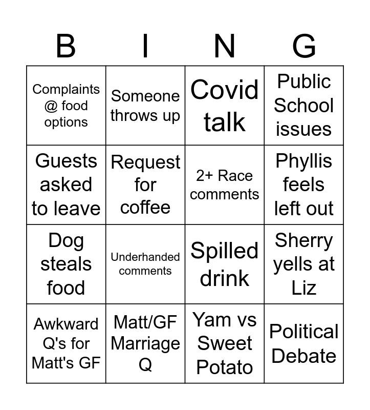 This bingo card has 16 words: Matt/GF Marriage Q, Sherry yells at Liz, Covid talk, Complaints @ food options, Dog steals food, Someone throws up, Spilled drink, Yam vs Sweet Potato, Guests asked to leave, Request for coffee, Awkward Q's for Matt's GF, Public School issues, Underhanded comments, Phyllis feels left out, 2+ Race comments and Political Debate.