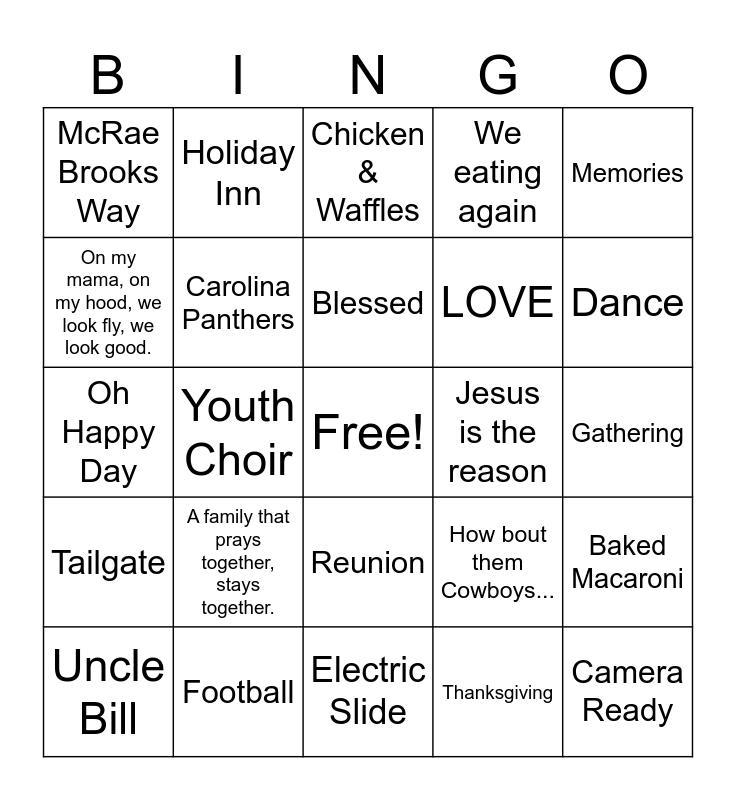 This bingo card has a free space and 29 words: Uncle Bill, Fellowship, Youth Choir, 14 Children, McRae Brooks Way, Chicken & Waffles, Carolina Panthers, A family that prays together, stays together., Jesus is the reason, Football, Gathering, Camera Ready, Electric Slide, Thanksgiving, Dance, Let's take a shot, Reunion, Tailgate, Memories, Oh Happy Day, How bout them Cowboys..., Aunt Barbara, LOVE, On my mama, on my hood, we look fly, we look good., We eating again, Holiday Inn, Baked Macaroni, Blessed and Chitterlings.