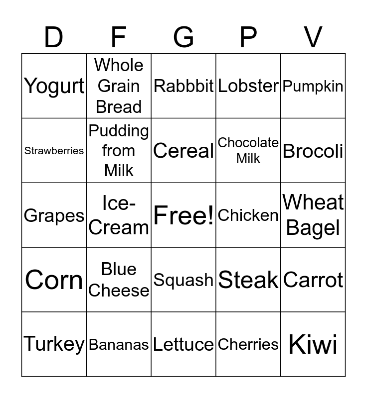 This bingo card has a free space and 24 words: Blue Cheese, Bananas, Cereal, Turkey, Pumpkin, Yogurt, Strawberries, Whole Grain Bread, Chicken, Squash, Chocolate Milk, Grapes, Steak, Carrot, Pudding from Milk, Cherries, Wheat Bagel, Rabbbit, Brocoli, Ice-Cream, Kiwi, Corn, Lobster and Lettuce.