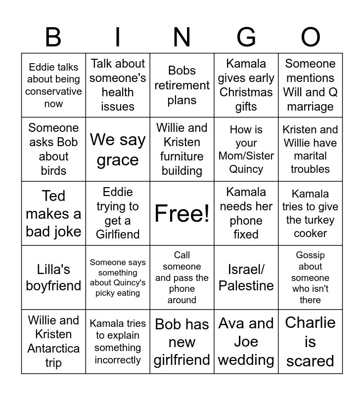 This bingo card has a free space and 24 words: Someone says something about Quincy's picky eating, Kamala tries to explain something incorrectly, Willie and Kristen furniture building, Willie and Kristen Antarctica trip, Someone mentions Will and Q marriage, Eddie talks about being conservative now, Someone asks Bob about birds, Talk about someone's health issues, Kamala needs her phone fixed, Call someone and pass the phone around, How is your Mom/Sister Quincy, Ted makes a bad joke, Israel/ Palestine, Gossip about someone who isn't there, We say grace, Ava and Joe wedding, Kamala tries to give the turkey cooker, Bobs retirement plans, Kristen and Willie have marital troubles, Eddie trying to get a Girlfiend, Charlie is scared, Lilla's boyfriend, Kamala gives early Christmas gifts and Bob has new girlfriend.