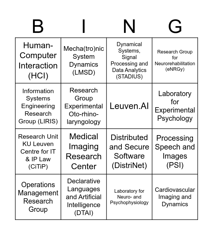 This bingo card has 16 words: Declarative Languages and Artificial Intelligence (DTAI), Processing Speech and Images (PSI), Dynamical Systems, Signal Processing and Data Analytics (STADIUS), Human-Computer Interaction (HCI), Research Unit KU Leuven Centre for IT & IP Law (CiTiP), Mecha(tro)nic System Dynamics (LMSD), Distributed and Secure Software (DistriNet), Laboratory for Neuro- and Psychophysiology, Information Systems Engineering Research Group (LIRIS), Research Group Experimental Oto-rhino-laryngology, Operations Management Research Group, Research Group for Neurorehabilitation (eNRGy), Medical Imaging Research Center, Laboratory for Experimental Psychology, Leuven.AI and Cardiovascular Imaging and Dynamics.