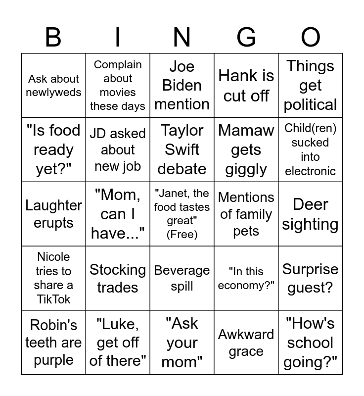 This bingo card has a free space and 59 words: Mention of Jeeves, "Luke, get off of there", Time for seconds, Nicole tries to share a TikTok, Awkward grace, Kids ask about present time, JD asked about new job, Troy is asleep before food, Mamaw gets giggly, Angry sports noises, Hank is cut off, Concerning yelling from basement, "Is food ready yet?", Start playing cards, "Mom, sit down", Ask about newlyweds, "How's school going?", Things get political, Gushing over baby, Taylor Swift debate, Mentions of family pets, Joe Biden mention, Robin's teeth are purple, Surprise guest?, Kids these days's slang, Corrin speaks Spanish, Corrin says something gross, Luke tries to get a mass "UEGH", Child(ren) sucked into electronic, Robin gets snuggly, Gossip about neighbor, Hank repeats story, Sandy and Ralph mention, Kids' sports, Complain about movies these days, "Pool boy" reference, Someone is snoring, "Mom, can I have...", "Ned Needlelander", Laughter erupts, Talk about Purdue, Stocking trades, Deer sighting, "Those poor cows", "Santa's watching", Elf on the Shelf discussion, Toy envy, Parents confiscate money envelope, Beverage spill, "Ask your mom", "Whose [drink] is this?", Trash bags come out, Rory's pool mention, Dylan and Monica wedding convo, Inflation woes, "In this economy?", College basketball, Family competition and Driveway mention.