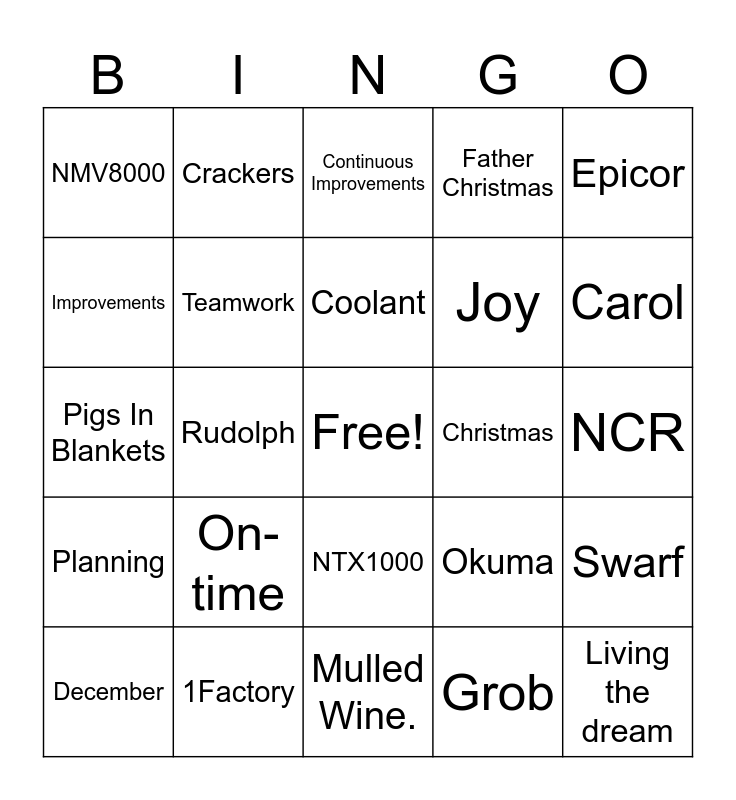 This bingo card has a free space and 33 words: Sleigh-bells-ring, Sage, Rudolph, RET, Planning, Teamwork, Epicor, December, Crackers, Snowflake, Coolant, Continuous Improvements, CNC, Christmas Tree, Christmas, Carol, 1Factory, Pigs In Blankets, On-time, Okuma, NTX1000, Snowman, NMV8000, NCR, Mulled Wine., Living the dream, Father Christmas, Joy, Improvements, Swarf, hyperMILL, Grob and Gifts.