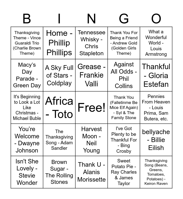 This bingo card has a free space and 71 words: Put Your Records On - Corinne Bailey Rae, Home - Phillip Phillips, One Love/People Get Ready - Bob Marley, Lovely Day - Bill Withers, Thank U - Alanis Morissette, thank u, next - Ariana Grande, Thank You For Being a Friend - Andrew Gold (Golden Girls Theme), Thank You - Dido, Against All Odds - Phil Collins, The Thanksgiving Song - Ben Rector, Isn't She Lovely - Stevie Wonder, I'll Be There For You - The Rembrandts (Friends Theme Song), Thankful - Gloria Estefan, Thanksgiving Theme - Vince Guaraldi Trio (Charlie Brown Theme), Gobble Gobble - Matthew West, It's Beginning to Look a Lot Like Christmas - Michael Buble, I've Got Plenty to be Thankful For - Bing Crosby, What a Wonderful World - Louis Armstrong, Take Me Home, Country Roads - John Denver, Pennies From Heaven - Louis Prima, Sam Butera, etc., The Thanksgiving Song - Adam Sandler, Thanksgiving Song (Beans, Greens, Tomatoes, Potatoes) - Keiron Raven, bellyache - Billie Eilish, Cups - Anna Kendrick (Pitch Perfect), Butter - BTS, Peaches - Jack Black (Bowser), Cherry Bomb - The Runaways, Red Red Wine - UB40, Pour Some Sugar on Me - Def Leppard, Dreams - Fleetwood Mac, Brown Sugar - The Rolling Stones, I Got You (Feel Good) - James Brown & The Famous Flames, Hold On, We’re Going Home - Drake, We are Family - Sister Sledge, Sweet Potato Pie - Ray Charles & James Taylor, Pass the Peas - The JB’s, Let’s Turkey Trot - Little Eva, I Want to Thank You - Otis Redding, Macy’s Day Parade - Green Day, Black Friday - Steely Dan, Harvest Moon - Neil Young, You’ve Got a Friend in Me - Randy Newman, You’re Welcome - Dwayne Johnson, Home Sweet Home - Motley Crue, Family Tradition - Hank Williams, Photograph - Nickelback, American Pie - Don McLean, A Sky Full of Stars - Coldplay, Ophelia - The Lumineers, I Ain’t Worried - OneRepublic, More Than a Woman - Bee Gees, Thank God - Kane Brown and Katelyn Brown, Thank You (Falletinme Be Mice Elf Again) - Syl & The Family Stone, Bless the Broken Road - Rascal Flatts, Memories - Maroon 5, Another One Bites the Dust - Queen, Grease - Frankie Valli, VeggieTales Theme Song - VeggieTales, Fancy Like - Walker Hayes, Sugar - Maroon 5, A Thousand Miles - Vanessa Carlton, Blessed - Martina McBride, Africa - Toto, Peaches - Justin Bieber, People are Crazy - Billy Currington, Kinfolks - Sam Hunt, Tennessee Whisky - Chris Stapleton, Stretchy Pants - Carrie Underwood, Turkey Lurkey Time - Megan Sikora et.al, Zombie - The Cranberries and Pecan Pie - Golden Smog.
