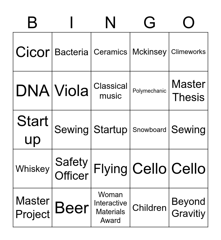 This bingo card has 79 words: Beer, 3D Printing, Ceramics, Carbon capture, New Phd, Startup, Mechanical Engineer, Internship, Chemical Engineer, Batteries, 3D Printing, Ceramics, Mckinsey, Cicor, Work late, DNA, Beer, Safety Officer, Mycelium, Sewing, Chemist, Climeworks, Start up, Classical music, Viola, IBM, Bubble tea, Startup, Spicy food, Haircuts, Master Thesis, Architecture, Woman Interactive Materials Award, Beyond Gravitiy, Master Project, Snowboard, Nestle, Drones, EMPA, Startup, Wollishofen, Zunft, HiWi, Startup, Master thesis, Bacteria, Basel, Wood, Finances, Social activities, Cello, Sewing, Cello, Dogs, Camping, Chemist, Hiking, Cooking, Startup, Flying, Polymechanic, Startup, Sewing, Ballet, Opera, Master thesis, Startup, Tortellini, 3D printing, Whiskey, Beer, Climbing, Sking, Snowboard, Ceramics, Children, Pottery, Children and Teeth.