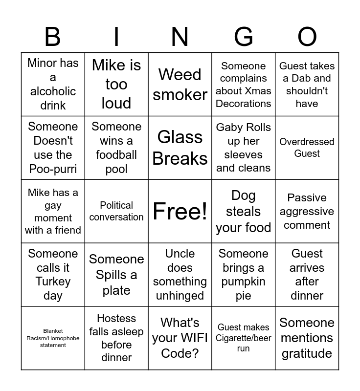 This bingo card has a free space and 24 words: Someone Spills a plate, Hostess falls asleep before dinner, Glass Breaks, Blanket Racism/Homophobe statement, Guest takes a Dab and shouldn't have, Minor has a alcoholic drink, Someone Doesn't use the Poo-purri, Mike is too loud, Dog steals your food, Uncle does something unhinged, Gaby Rolls up her sleeves and cleans, Mike has a gay moment with a friend, Someone brings a pumpkin pie, Guest arrives after dinner, Someone wins a foodball pool, Guest makes Cigarette/beer run, Passive aggressive comment, Weed smoker, Overdressed Guest, Political conversation, Someone mentions gratitude, Someone calls it Turkey day, Someone complains about Xmas Decorations and What's your WIFI Code?.