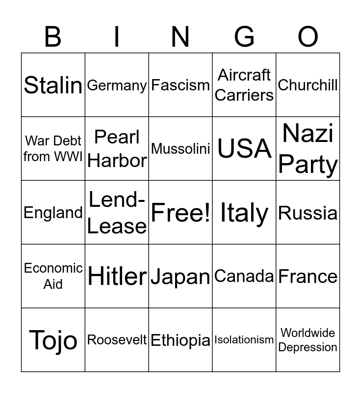 This bingo card has a free space and 24 words: Hitler, Roosevelt, Mussolini, Tojo, Churchill, Stalin, War Debt from WWI, Germany, Italy, Japan, USA, England, Canada, France, Pearl Harbor, Isolationism, Russia, Fascism, Nazi Party, Lend-Lease, Worldwide Depression, Economic Aid, Aircraft Carriers and Ethiopia.