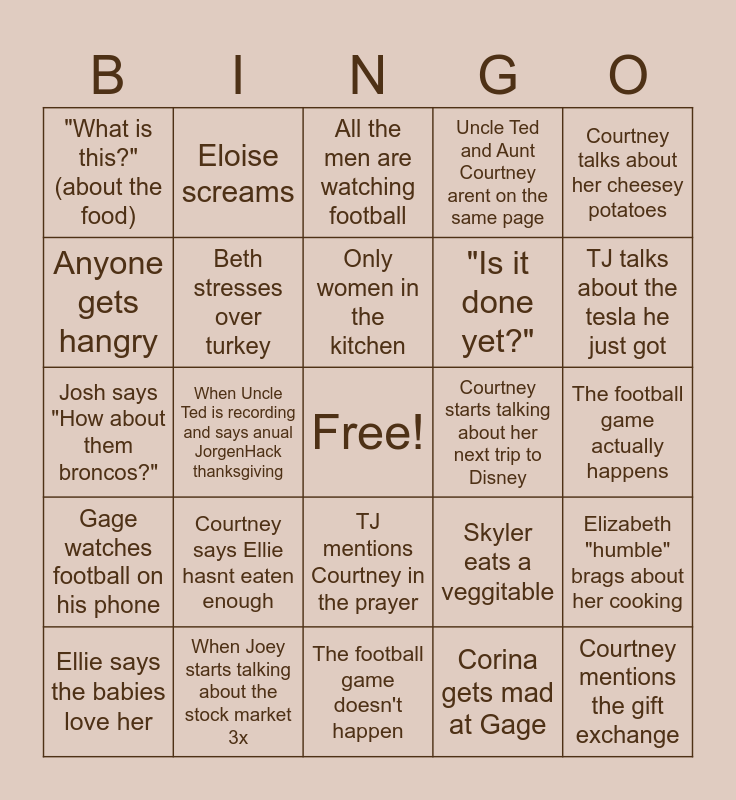 This bingo card has a free space and 33 words: When Courtney Yells at Kids, When something is "too spicy", When Uncle Ted is recording and says anual JorgenHack thanksgiving, Dana disassociates, Gage watches football on his phone, Beth stresses over turkey, Courtney talks about her cheesey potatoes, Ellie says the babies love her, Eloise screams, Skyler and Jonah are late, Only women in the kitchen, All the men are watching football, Tori handles 3 kids singlehandedly, Beth ignores a direct question to her more than 3x, Courtney starts talking about her next trip to Disney, TJ talks about the tesla he just got, When Joey starts talking about the stock market 3x, Josh says "How about them broncos?", Courtney says Ellie hasnt eaten enough, Skyler eats a veggitable, TJ mentions Courtney in the prayer, "Which one is this?" (about the twins), "What is this?" (about the food), The football game actually happens, The football game doesn't happen, Courtney mentions the gift exchange, Uncle Ted and Aunt Courtney arent on the same page, "Is it done yet?", Anyone gets hangry, Elizabeth "humble" brags about her cooking, Corina stresses about her pie, Corina gets mad at Gage and Ted talks about his boat.