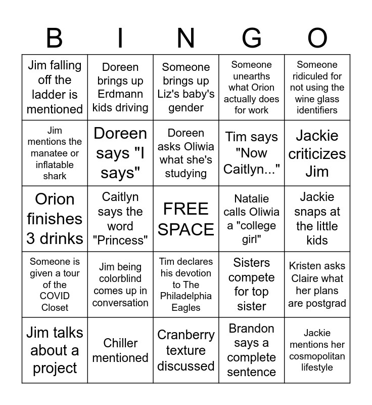 This bingo card has a free space and 41 words: Mashed Potatoes from last year mentioned, Orion finishes 3 drinks, Molzon Family Rules mentioned, Doreen says "I says", Chiller mentioned, Tim declares his devotion to The Philadelphia Eagles, Doreen asks Oliwia what she's studying, Jim calls Baxter "lazy mutt", Someone ridiculed for not using the wine glass identifiers, Someone is given a tour of the COVID Closet, Caitlyn says the word "Princess", Someone unearths what Orion actually does for work, Jackie mentions her cosmopolitan lifestyle, Jackie snaps at the little kids, Natalie calls Oliwia a "college girl", Jim being colorblind comes up in conversation, Someone is accused of setting off 'the alarm', Jim falling off the ladder is mentioned, Non-family member remarks on napkin folding technique, Someone brings up Liz's baby's gender, Kristen asks Claire what her plans are postgrad, Reggie discussed, Cranberry texture discussed, Tim says "Now Caitlyn...", Kevin wows the Middleton family in some unsuspected way, Granny knits or crochets during event, Brandon says a complete sentence, Claire or Oliwia spend 30 minutes playing a game with little kids, Jackie criticizes Jim, Kristen talks about her commute, Alexander lights up a cigar, Doreen brings up Erdmann kids driving, Jim talks about a project, Jim talks about airplane travel, Sisters compete for top sister, Jim mentions the manatee or inflatable shark, Dog show discussed, Detroit Lions win, Peyton Manning (lizard) mentioned, Peyton Manning (person) mentioned and Jim expresses optimism towards Duke Basketball this year.