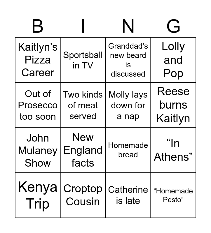 This bingo card has 16 words: Croptop Cousin, “In Athens”, Granddad’s new beard is discussed, Kaitlyn’s Pizza Career, John Mulaney Show, Sportsball in TV, Homemade bread, Catherine is late, Out of Prosecco too soon, Two kinds of meat served, Kenya Trip, Lolly and Pop, New England facts, Reese burns Kaitlyn, Molly lays down for a nap and “Homemade Pesto”.