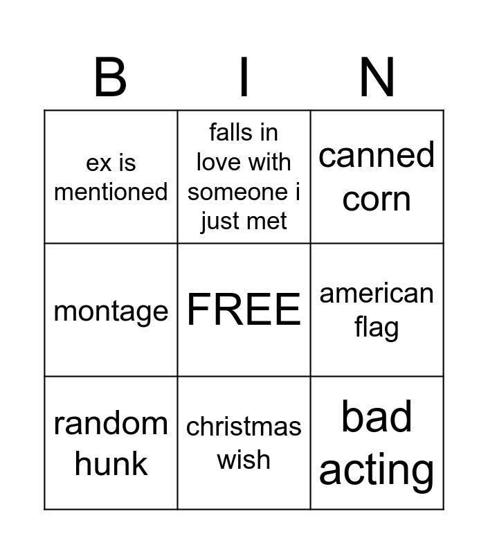 This bingo card has a free space and 14 words: christmas party, santa is real, random hunk, falls in love with someone i just met, montage, bad acting, singing, fireplace, christmas wish, ex is mentioned, someone writes a song, american flag, canned corn and happy ending.