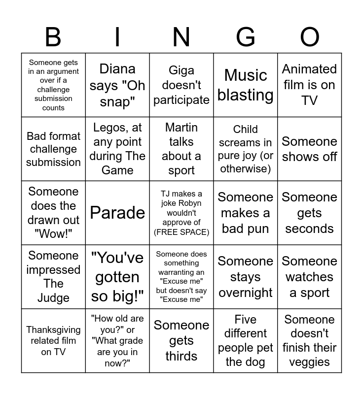This bingo card has a free space and 34 words: Someone finds one of the cats, Five different people pet the dog, Frisbee, Someone talked about politics, Someone impressed The Judge, Legos, at any point during The Game, Animated film is on TV, Thanksgiving related film on TV, Diana says "Oh snap", Grant shares a recipe, Martin talks about a sport, Giga doesn't participate, Gina doesn't participate, Someone is in the bathroom for an excessive amount of time, Someone makes a bad pun, Someone shows off, "How old are you?" or "What grade are you in now?", Someone does the drawn out "Wow!", "You've gotten so big!", Someone stays overnight, Someone does something warranting an "Excuse me" but doesn't say "Excuse me", "I'm thankful for", Someone gets in an argument over if a challenge submission counts, Someone gets seconds, Someone gets thirds, Someone doesn't finish their veggies, Music blasting, Christmas related anything (that isn't Ryan Reynolds), Child screams in pure joy (or otherwise), Bad format challenge submission, Child draws a turkey, Parade, Someone watches a sport and YIPPIE (another free space lucky you).